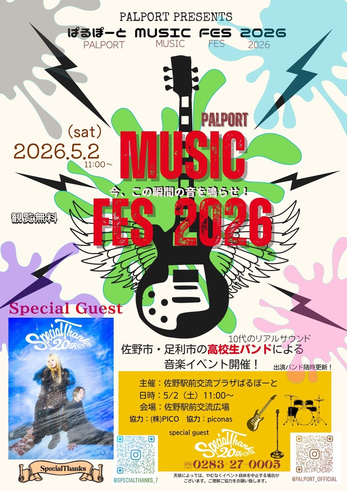 PALPORT PRESENTS ぱるぽーと MUSIC FES 2026 SCHEDULE 2026/05/02(土) 栃木県 佐野駅前交流広場 START 11:00~ 入場無料!! 高校生バンドによる音楽イベントへゲスト出演します! URLをコピーする 報告する